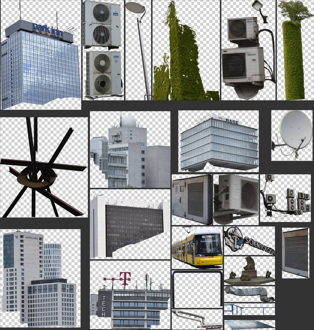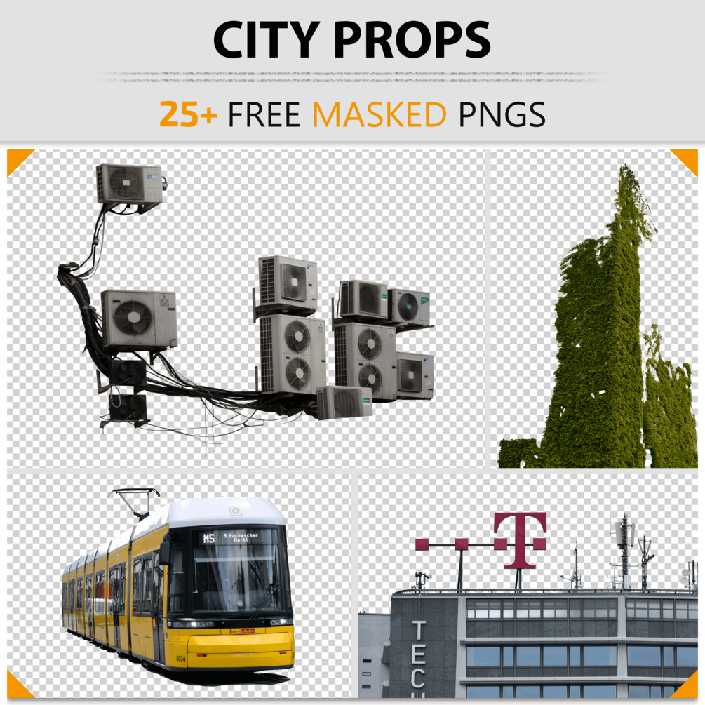 A small masked set of various city props ranging from buildings to whole conditioning systems and greenery. Use it wherever you want!